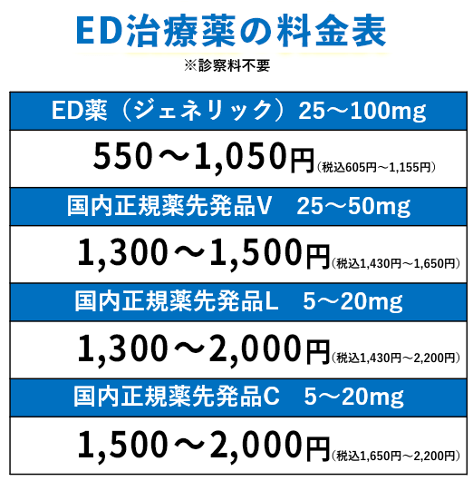 ※医療広告ガイドラインの規定により、ED治療薬の具体的な薬剤名をホームページに掲載できません。 患者様にはご不便おかけして申し訳ございませんがご了承ください。